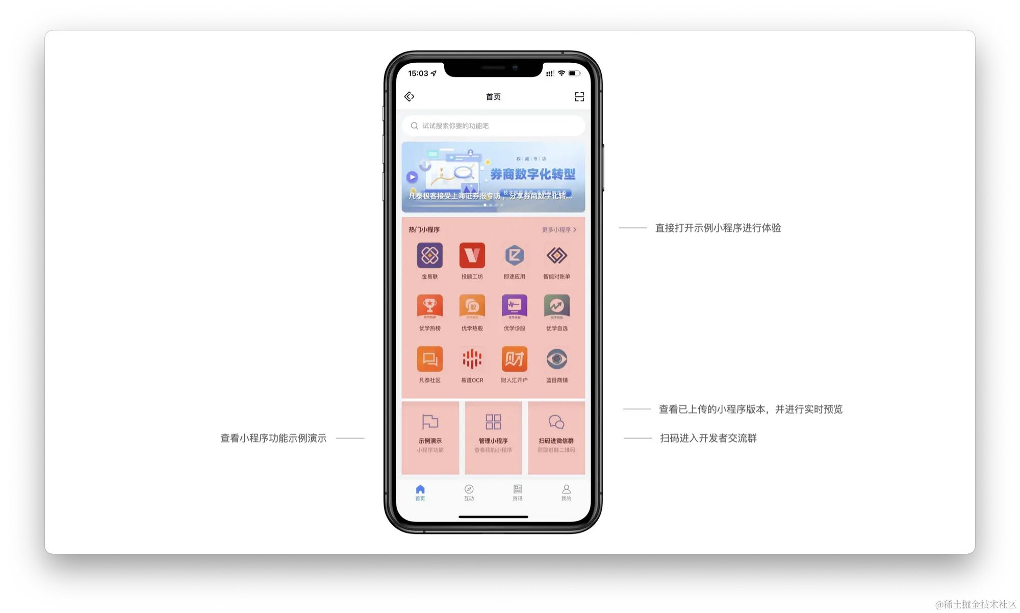 点击「首页」中的「热门小程序」可以打开相关的小程序,体验 FinClip 中各类小程序的实现效果与实际作用,点击「示例演示」则可以查看 FinClip 中小程序的各类组件演示,预览不同接口下的具体实现方式。