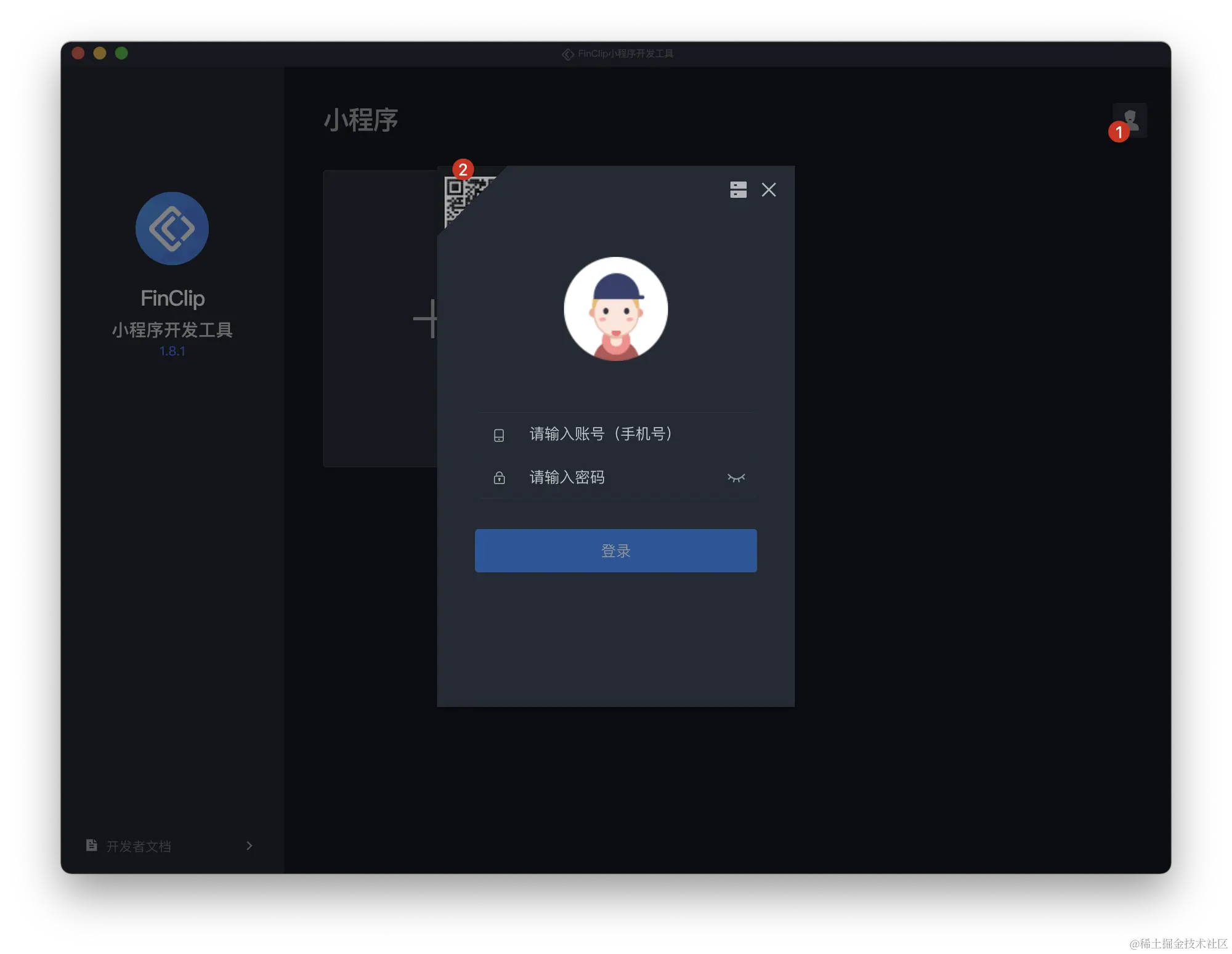 如果你已经下载了移动应用「FinClip」并完成了账户登录的话,也可以点击「2-切换登录方式」,使用扫码的方式进行登录。