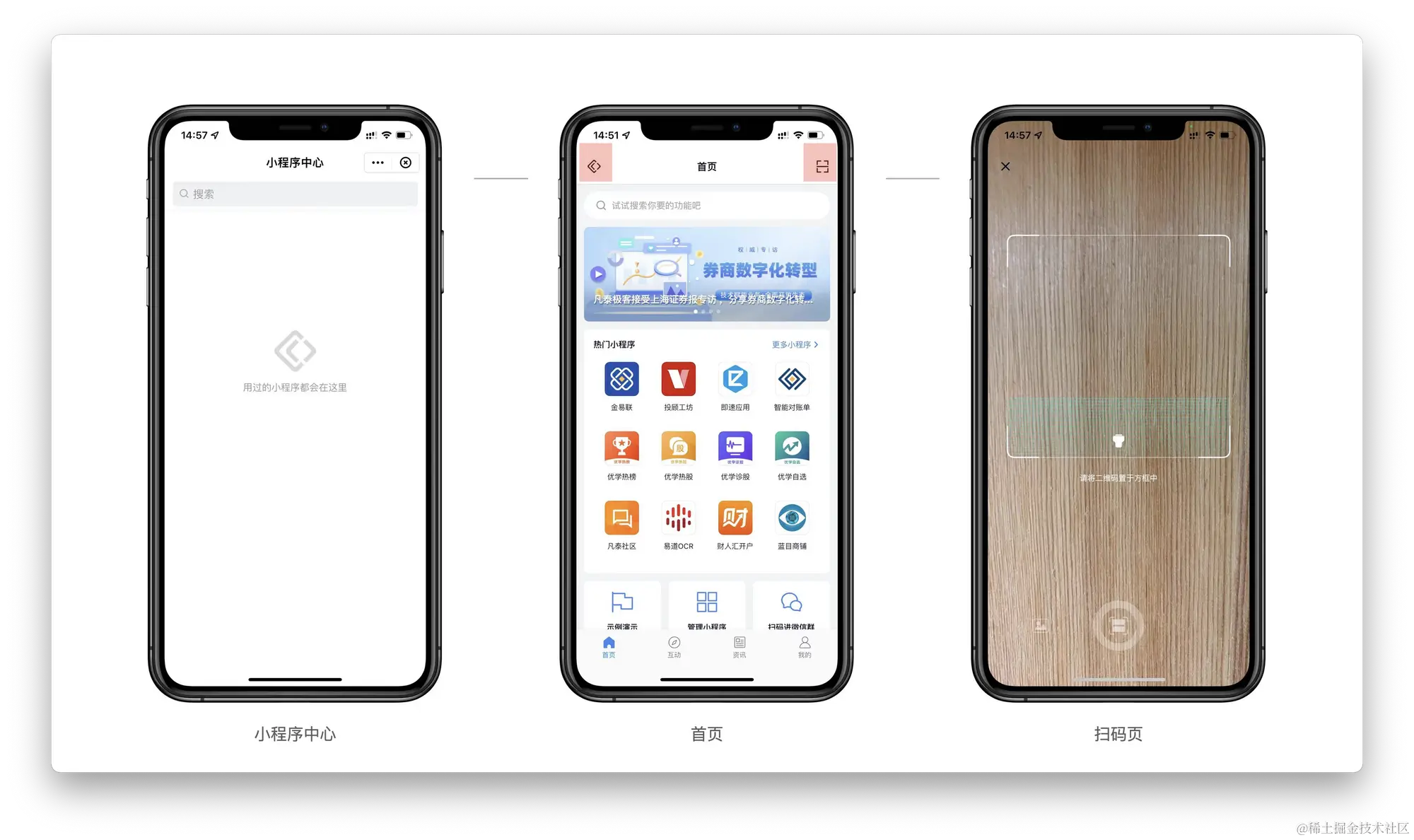 点击页面左上角和右上角的 2 个按钮,还可以分别进入「小程序中心」与「扫码」页面,在小程序中心中,会展示用户近期所访问过的小程序内容,而扫码页则可以用来登录 FIDE 或扫描小程序预览码,进行测试等。