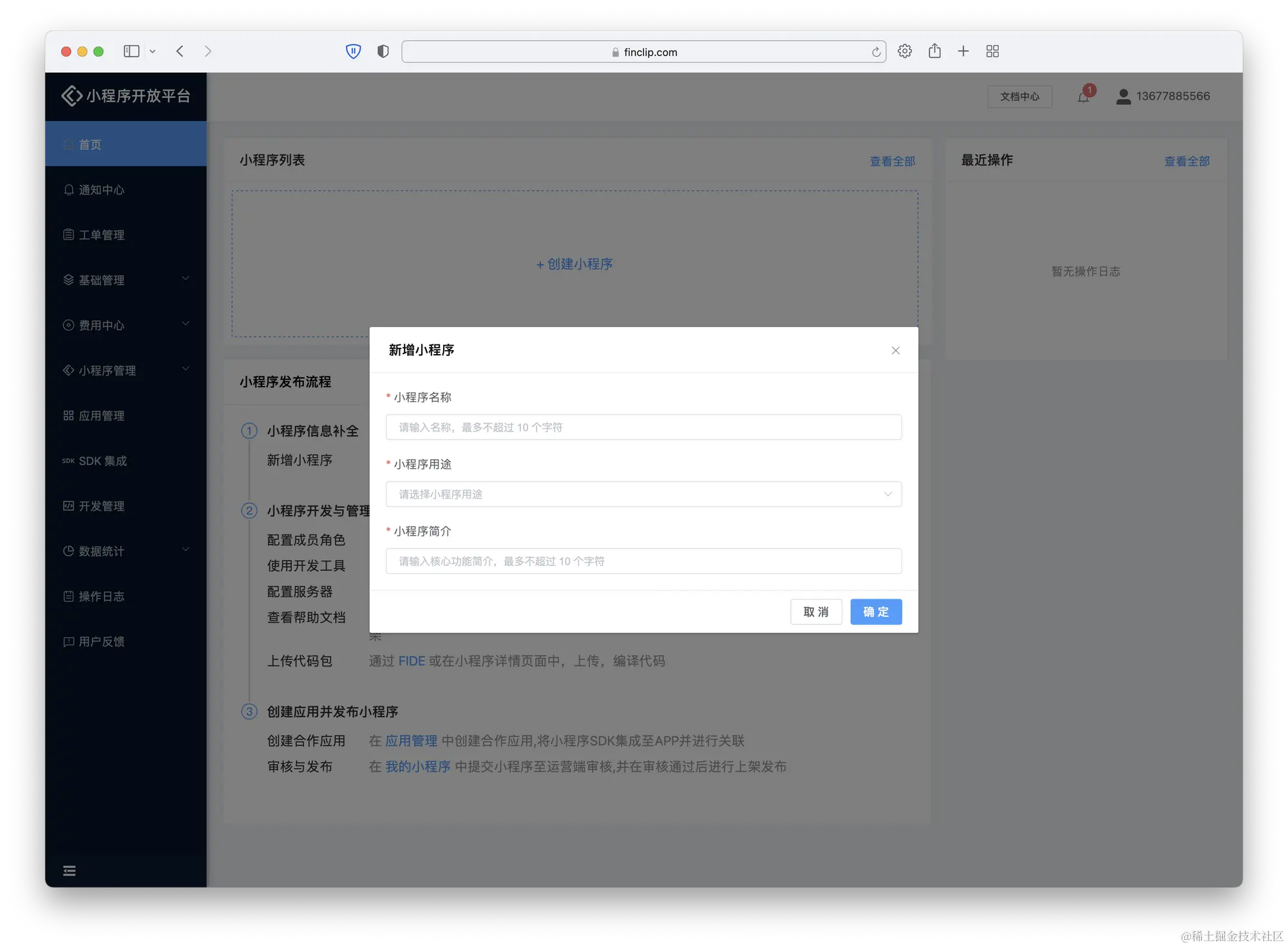 与常见的其他小程序平台不同,FinClip 支持一个用户账户下拥有多个小程序进行使用与体验(在 FinClip.com 中,体验版用户支持免费体验最多 99个小程序),因此我们需要先点击「管理后台-首页-小程序列表」中的「创建小程序」,在补充小程序的名称,用途与简介内容后,就可以完成小程序的创建了。