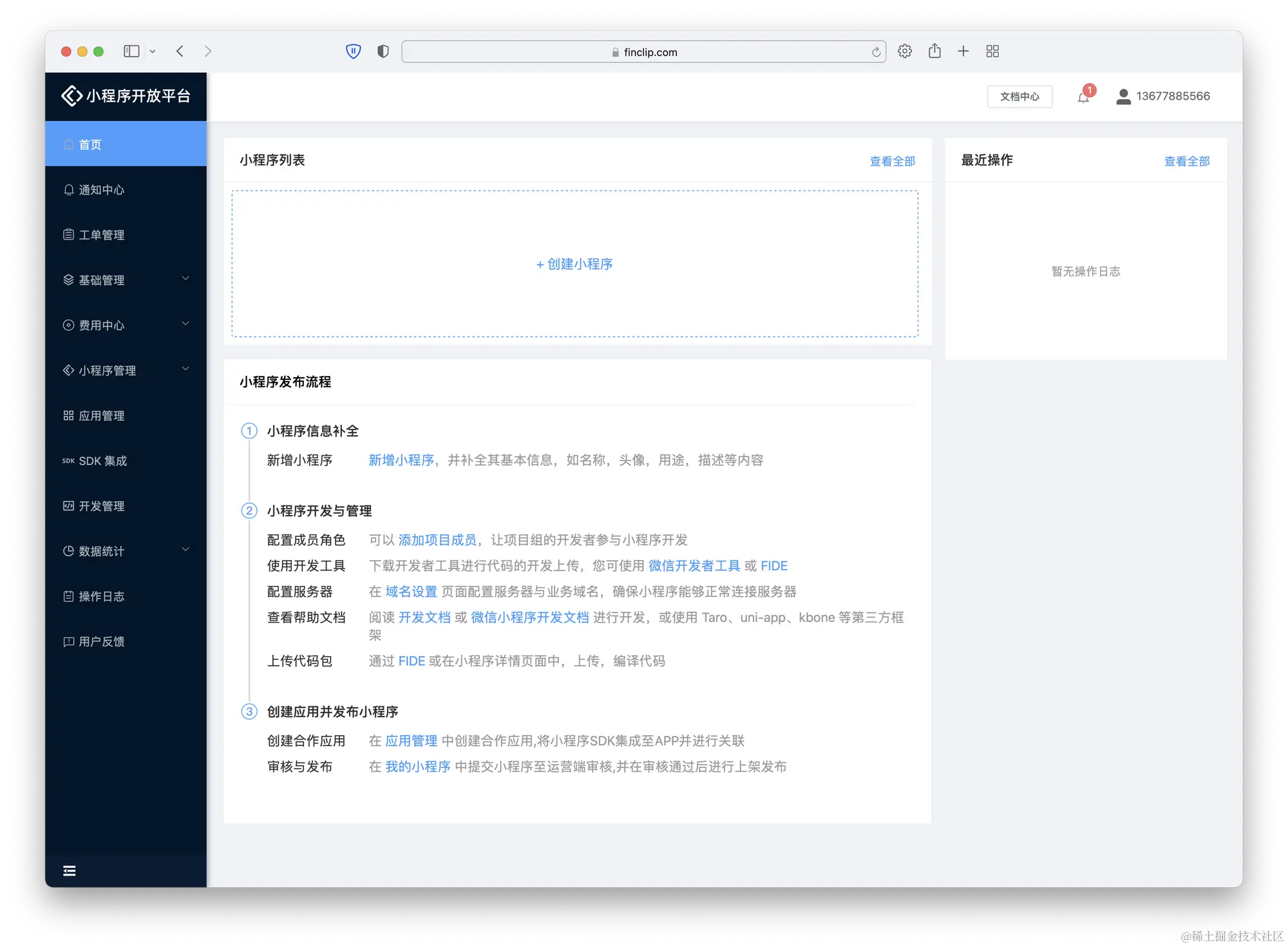 在完成账号注册后,系统会自动跳转到 FinClip 小程序开放平台的管理后台中。在管理后台中我们提供了许多与小程序,应用,安全相关的配置项,开发者可以根据自己的实际需要进行相关的配置。