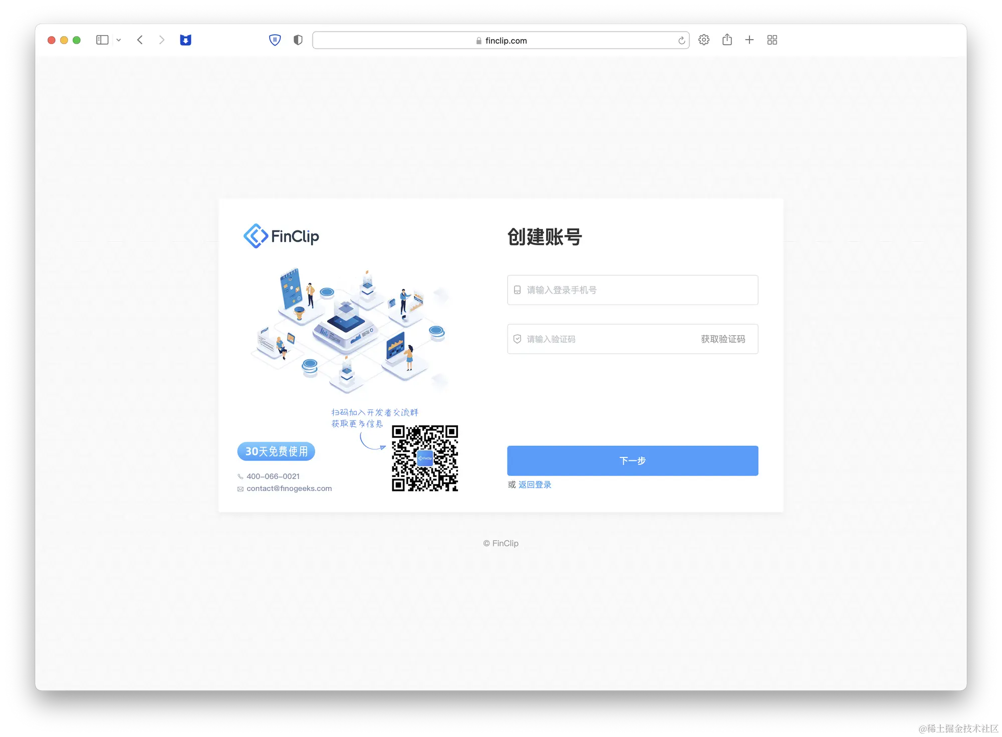 既然是在讨论 FinClip 小程序的开发与使用,那第一步当然需要前往 FinClip.com 注册一个小程序账号,请登录 finclip.com/#/login?typ… ,在分别输入团队名称,邮箱与密码后,点击底部的按钮,即可完成注册。