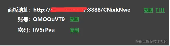 安装完成以后打开会出现初始信息,里面包含地址和账号密码,关闭面板以后会出现面板工具箱,可以进行一些配置