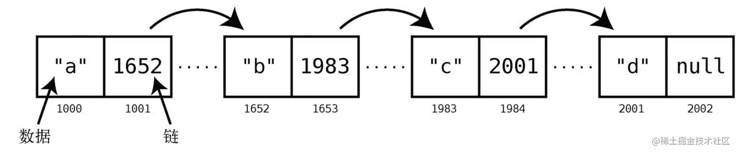 链表的每个元素都存储了下一个元素的地址,从而使一系列随机的内存地址串在一起。