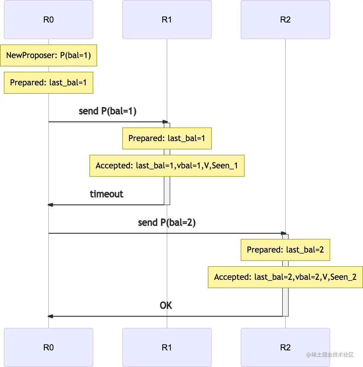 要达到 paxos 要求的 2/3 的多数派,也只需要将 proposer 发到另外一个 replica,因为这个 proposer 永远只有 1 个实例,所以不会出现不一致(proposer 或者在 R0 上工作或者在在 R1 上工作)。