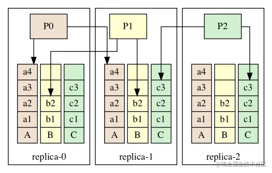 在 mmp3 的实现中,有 3 个 replica 就需要有 3 列 instance,每个 replica 只写其中一列。