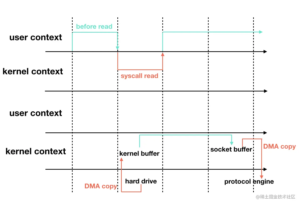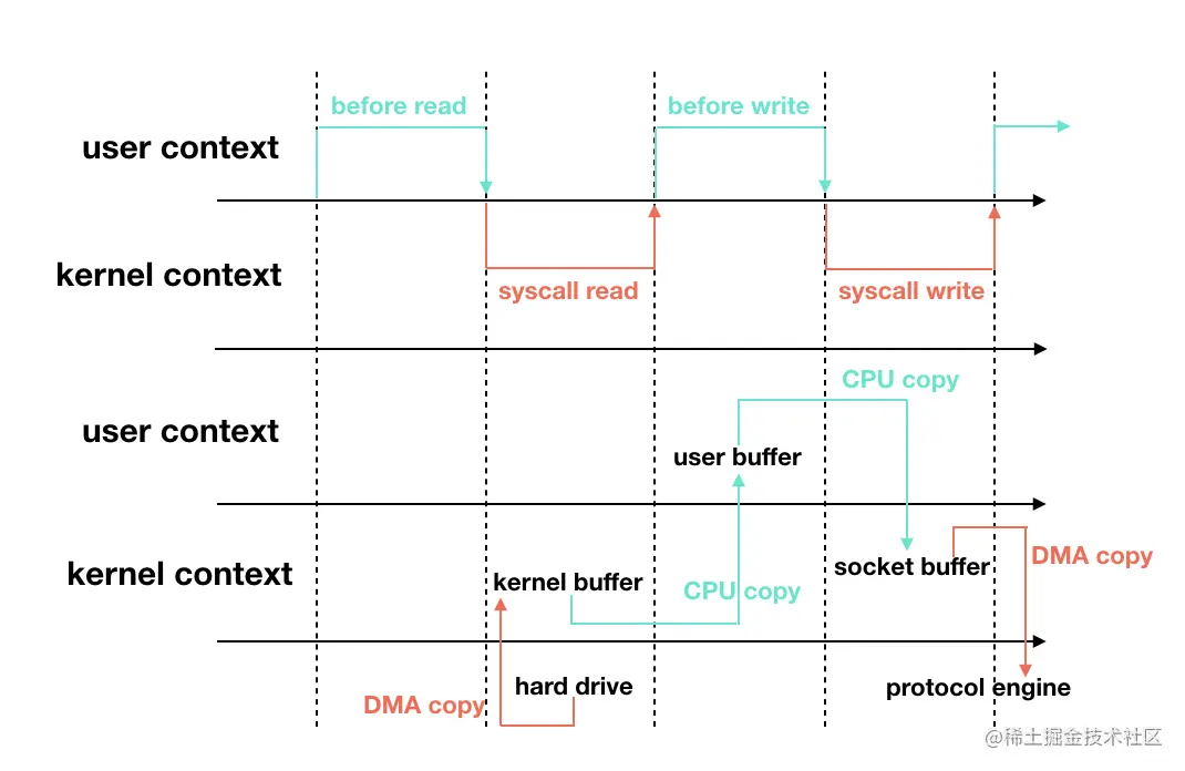 可以看到普通的transfer的过程:硬盘 -> 内核buffer -> 用户buffer ->内核socket缓冲区 -> TCP 协议栈