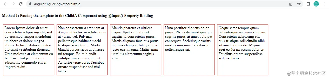 ChildAComponent模板。正 如你所看到的,我们已经将模板参考变量传递给ngTemplateOutlet ,数据 被传递给ngTemplateOutletContext 以在模板中显示。