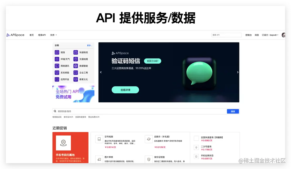 而实际上我们平时常说的 API 实际上指的是 API 背后提供的服务或数据,例如短信接口、天气接口。
