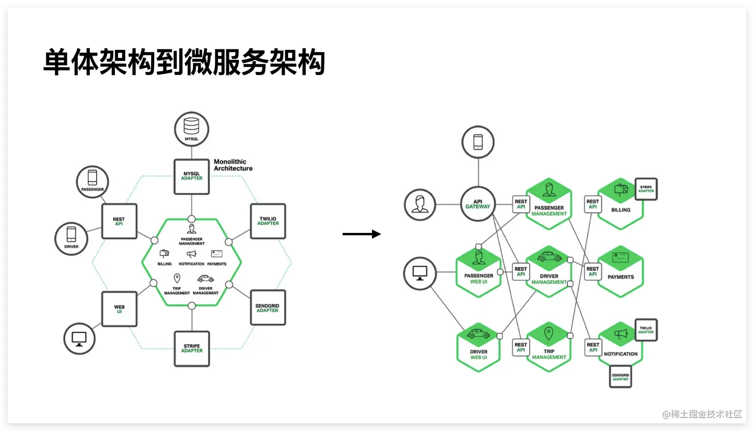 当它里面的每个业务逻辑都被分解为一个微服务,就变成了微服务架构。通常情况下,这些客户端并不能直接访问后台微服务,而是通过 API 网关来传递请求。