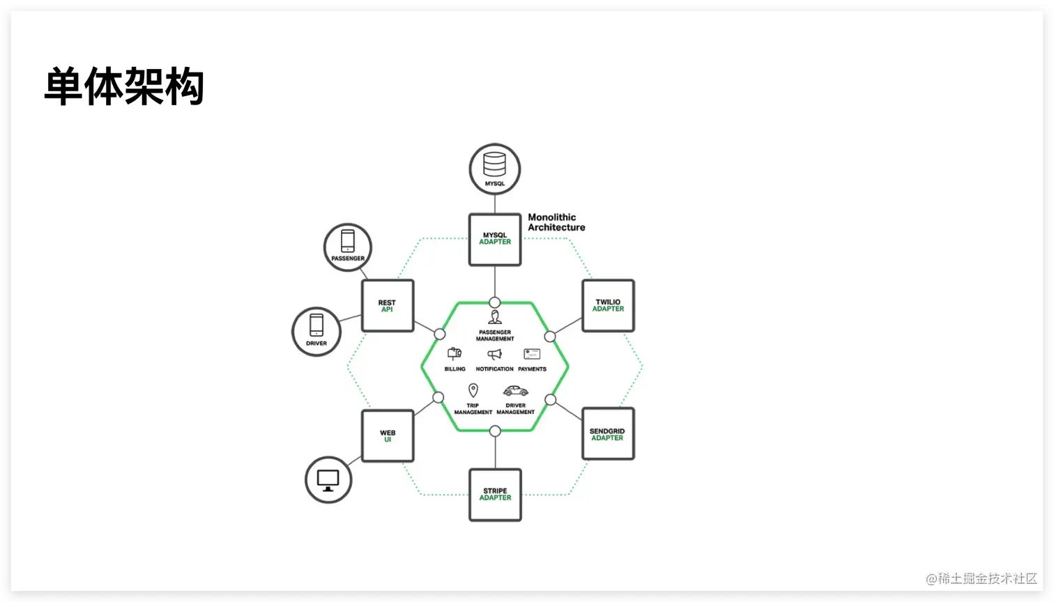 所有服务都在一个应用里面的叫单体架构。