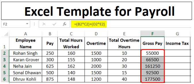 - 现在,将所有员工的这些细节按列添加,如A列中的员工姓名,B列中的每小时工资率,以此类推,直到E列,即直到加班时间总数。下面的屏幕截图说明了这一点。
