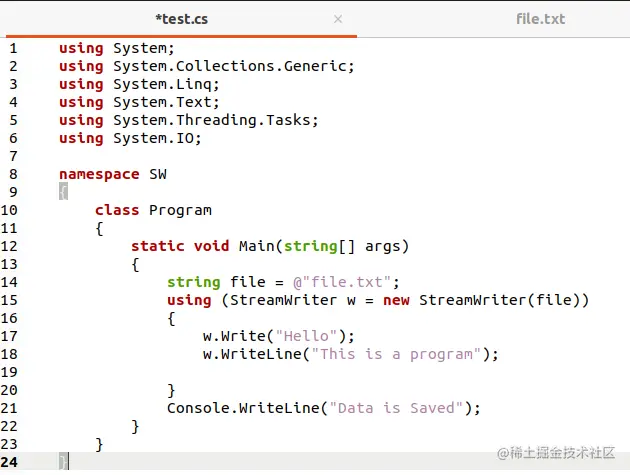 在Ubuntu 20.04中使用C#中的StreamWriter类在文件中写入文本。