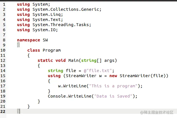 在Ubuntu 20.04中通过使用C#编程语言中的streamwriter类在文本文件中保存一个变量。