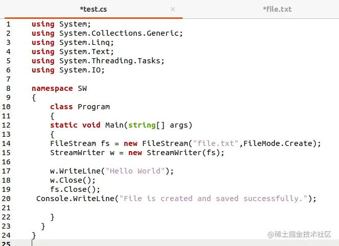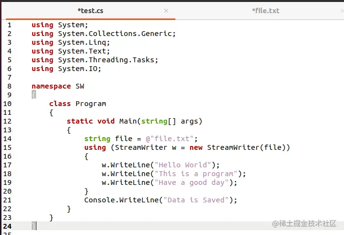 在Ubuntu 20.04中使用C#中的StreamWriter类在文件中写入文本。