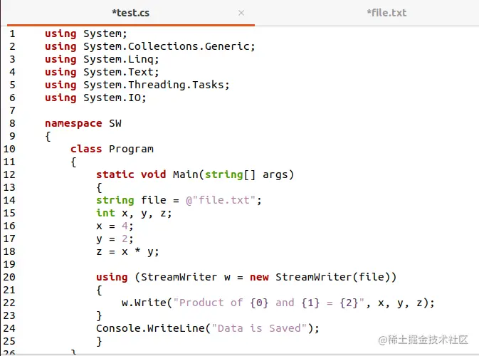 在Ubuntu 20.04中通过使用C#编程语言中的streamwriter类在文本文件中保存一个变量。