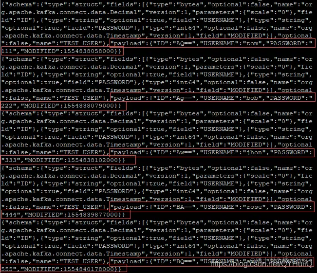 这里先暂存一个疑问:为什么Oracle中的id是1,2,3,4,5,但是topic中读取消息的id是字母(如:AQ==)。
