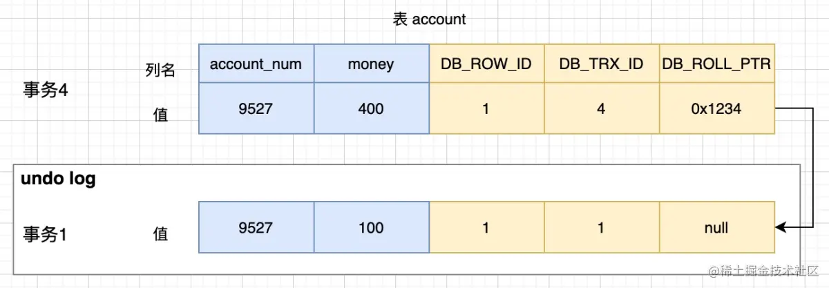 这时又开启了一个新的事务 4 ,修改 money = 400,并提交了事务。这时数据库中的数据结构如下所示: