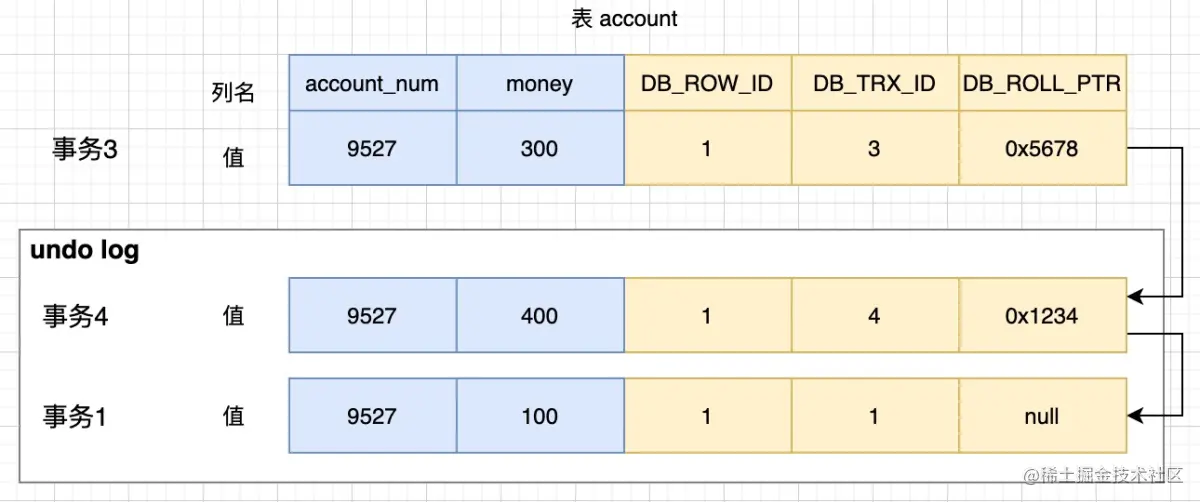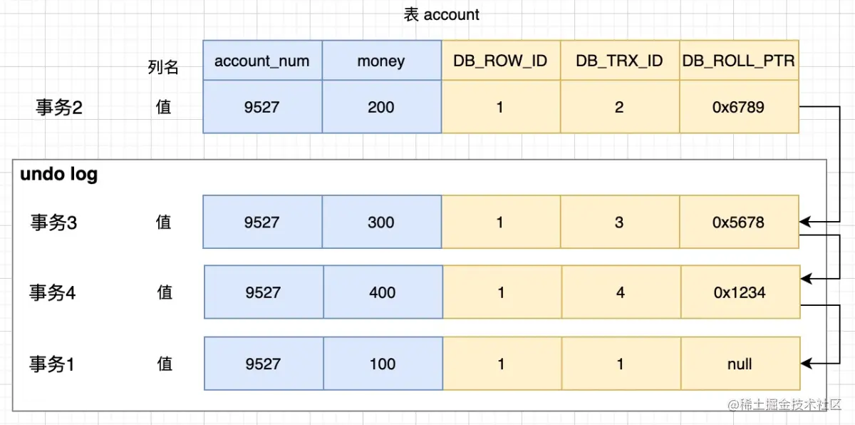 当事务 2 将 money 字段值改为 200 的时候,首先数据库将对该行加排他锁,然后将此行数据拷贝到 Undo Log 中。拷贝完毕后,修改此行的 money 字段值为 200,并修改 DB_ROLL_PTR 指向刚拷贝到 Undo Log 中的数据行,假设数据地址是 0x1234。这样就形成如下的数结构。