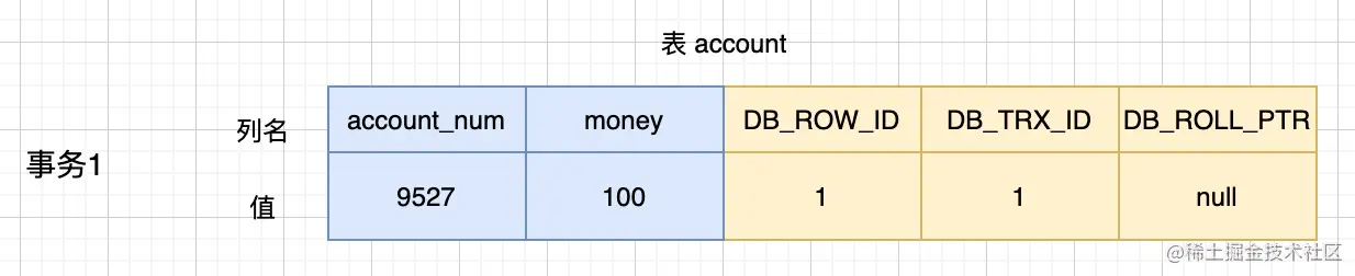 例如,当我们开启事务 1 ,对 account 表执行如上 Insert 语句,将在表上生成如下数据,这时还没生成 Undo Log。