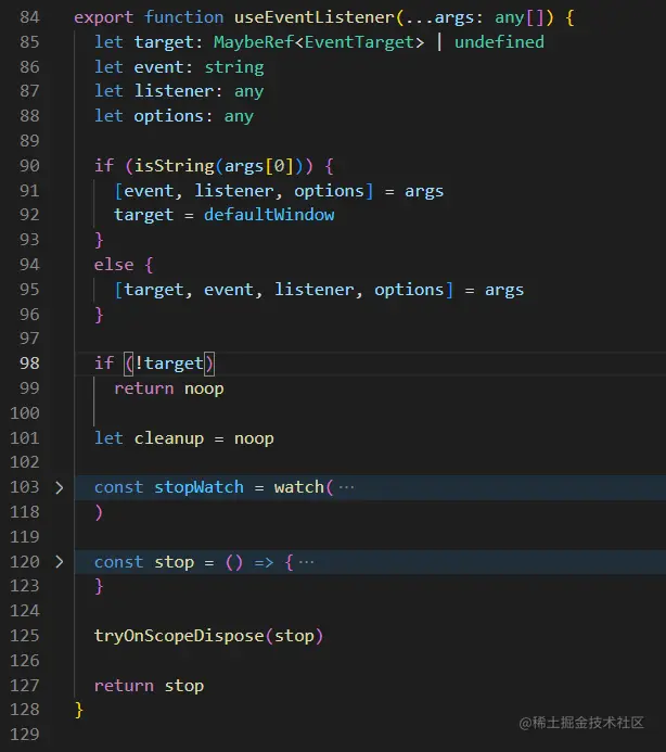 可以看到useEventListener最终将stop方法作为返回值,这可以方便使用者手动调用stop方法。