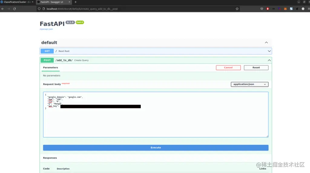 然后前往localhost:8000/docs,尝试使用/add_to_db/端点,请求主体如下。