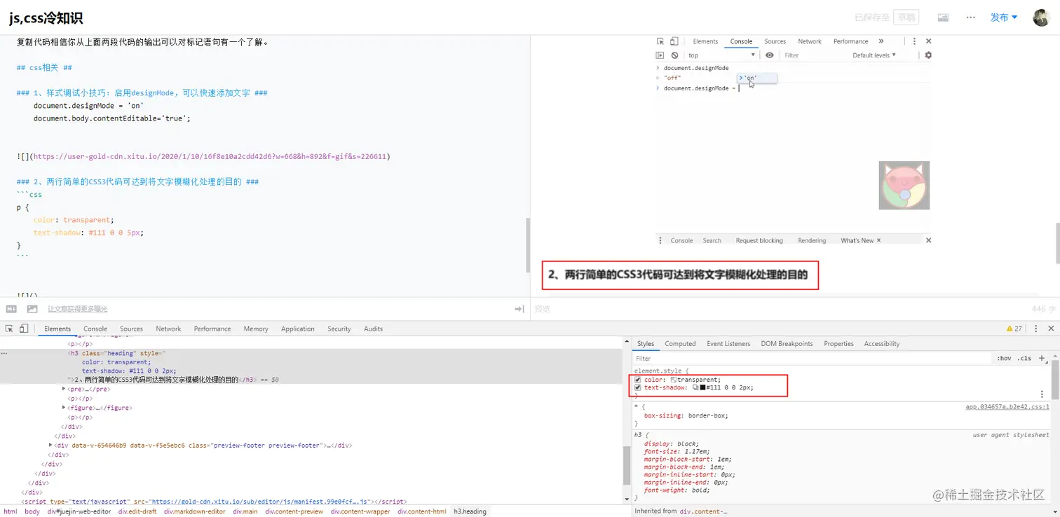 1、样式调试小技巧:启用designMode,可以快速添加文字