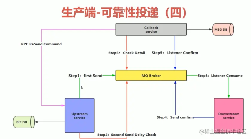 1.消息的成功发送 -> 2.MQ 节点的成功接收 -> 3. 发送端收到 MQ 节点(Broker)确认应答 -> 4. 完善消息进行补偿机制