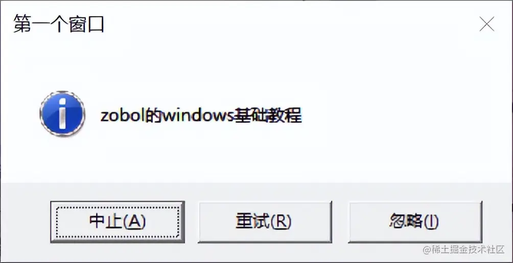 #include "windows.h"int WINAPI WinMain(HINSTANCE hInstance, HINSTANCE hPrevInstance,LPSTR lpCmdLine,int nCmdShow){MessageBox(NULL, L"zobol的windows基础教程", L"第一个窗口",MB_ABORTRETRYIGNORE | MB_ICONASTERISK);}
