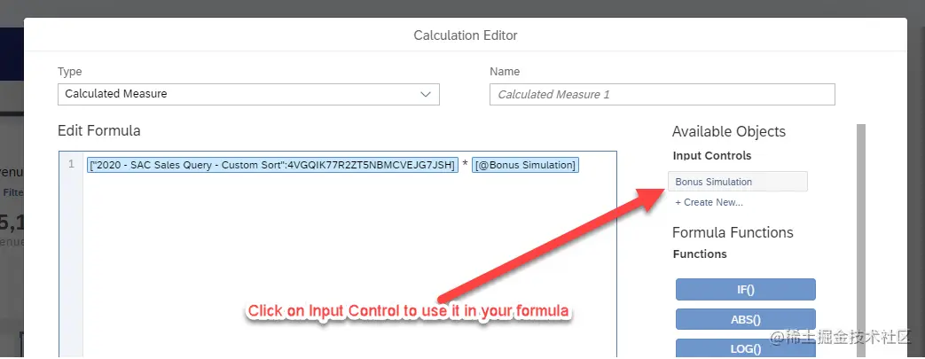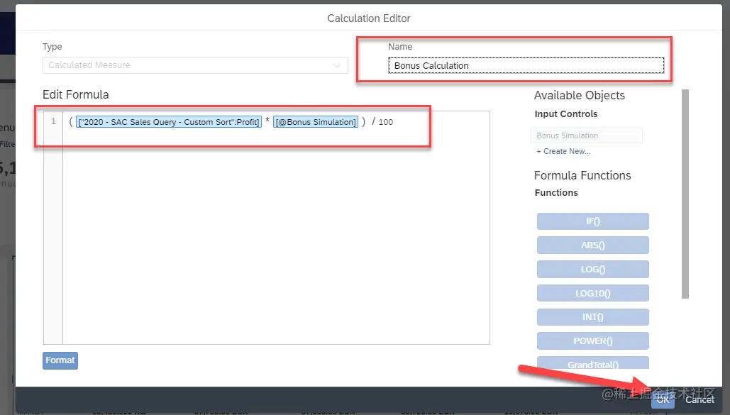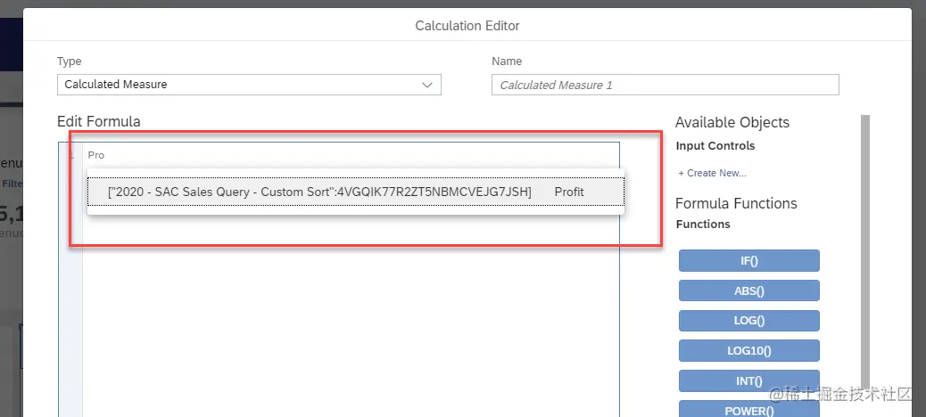 在下一步,我们将定义我们的计算。让我们在公式编辑器中选择 "利润"。