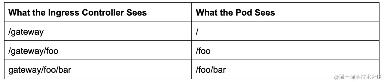 这个规则的作用是捕获所有进入入口控制器的流量,匹配以"/gateway/"开头的任何内容,删除"/gateway/",然后将请求传递给pod。如果URI在"/gateway/"之后还有其他部分,那么在请求被传递到pod时,它仍然是URI的一部分。希望一个例子能使事情变得更清楚。