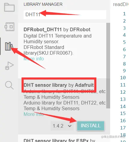 在这里我们选择 Adafruit 提供的 DHT sensor library 支持库,它还依赖 Adafruit Unified Sensor 库,下面我们详细操作: