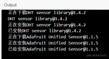 这里 Arduino IDE 自动提示我们想要使用 DHT sensor library 还需要安装 Adafruit Unified Sensor,我们直接点击 Install all 让它自动安装,成功后可以在输出界面看到这样的提示: