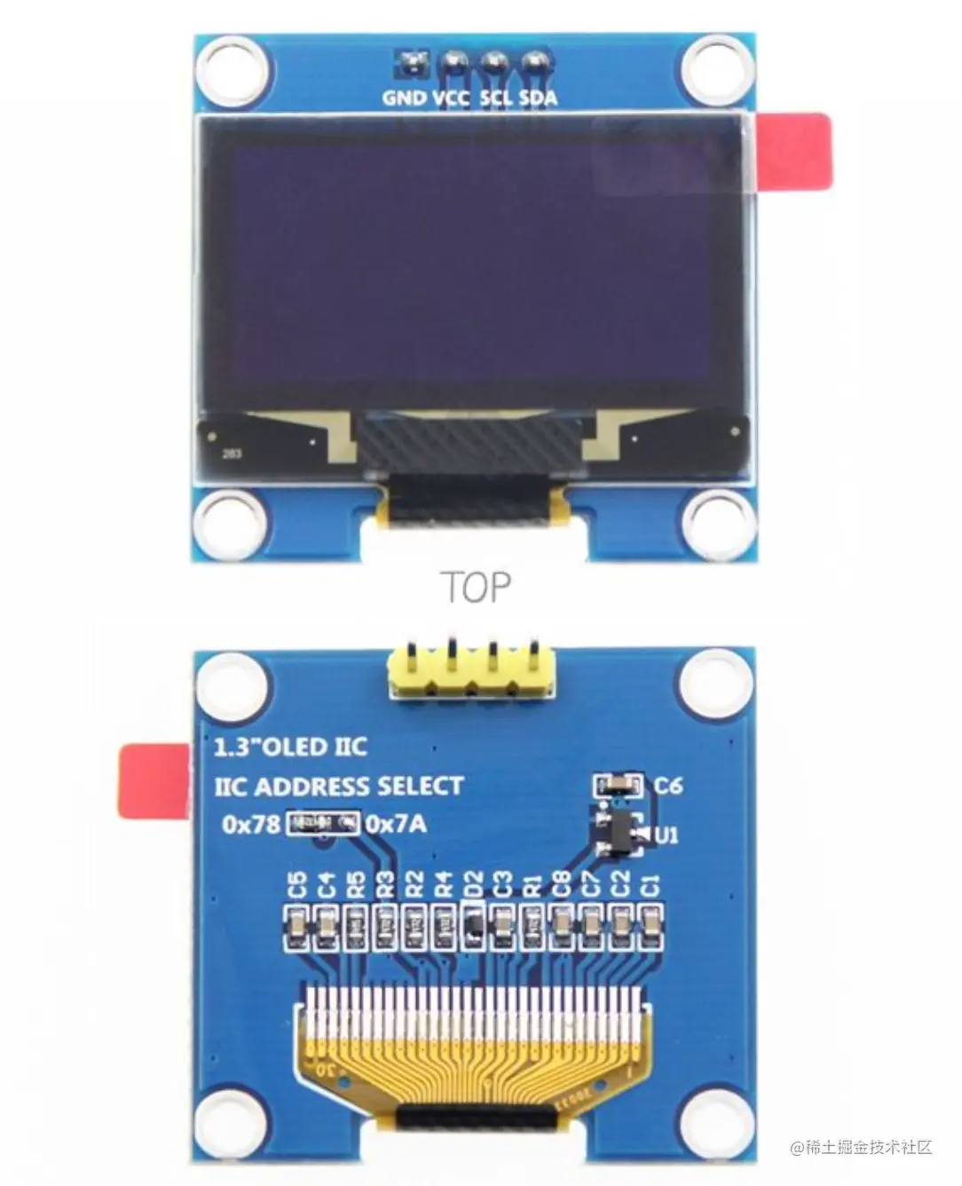 本节我们会用到名为 SH1106 的 1.3寸 OLED 显示屏,我用的是 SH1106 使用 I2C 方式进行操作,只用到四根线 VCC、GND、SDA、SCL 分辨率为 128x64 ,它长这个样子:
