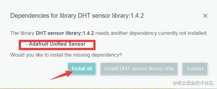 点击左侧 Libraries 栏目,在搜索框中输入 DHT11 找到 DHT sensor library by Adafruit,点击 INSTALL 进行安装,然后会提示我们需要安装一些依赖项目: