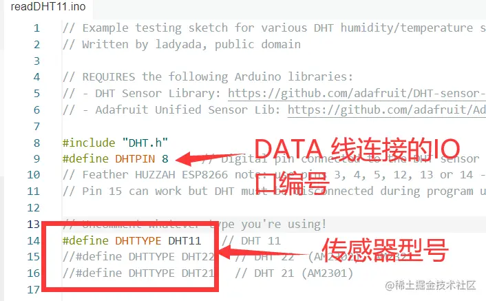 安装好之后我们找到 Arduino IDE 上方选项卡打开:File->Examples->DHT sensor library->DHTtester 即可打开 DHT sensor library 使用例程。