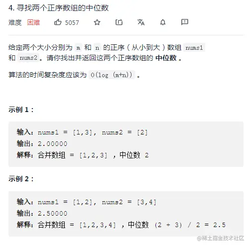 根据中位数的定义,当 是奇数时,中位数是两个有序数组中的第 个元素,当 是偶数时,中位数是两个有序数组中的第 个元素和第 个元素的平均值。因此,本题可以转化成寻找两个有序数组中的第 小的数,其中 k 为 或 。