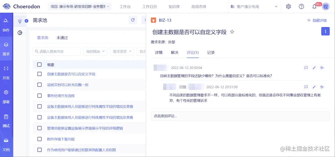 同时,借助需求的评论功能,可以建立需求提出人与研发团队的沟通渠道,对需求澄清过程中的重要信息实现线上记录。