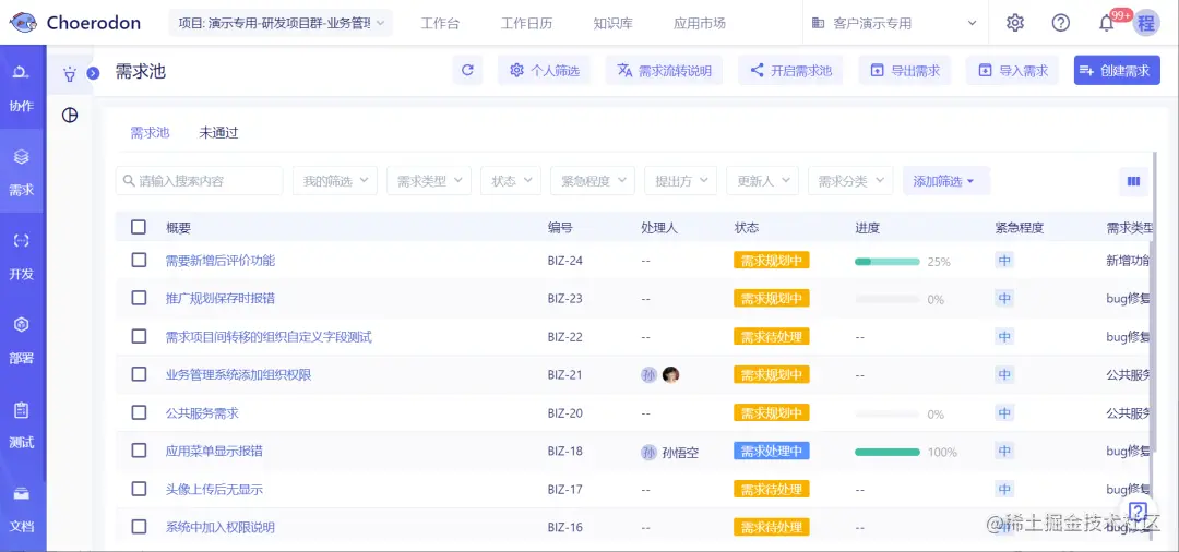 猪齿鱼研发管理工具,提供了统一的需求收集渠道,连接用户与研发团队。同时,可以根据公司的管理规范,自定义需求提报后的审批流程,以方便各方及时获取和审核需求信息。需求池让需求回归业务本质、回归问题根本,解决了需求问题域的问题。