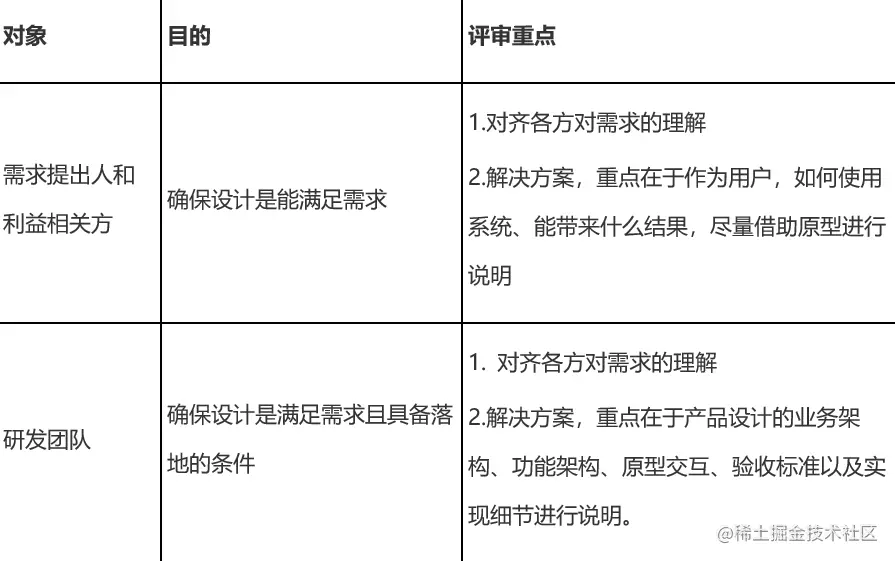 评审需求解决方案时通常要面向两类对象,目的和侧重点有所差异,具体如下: