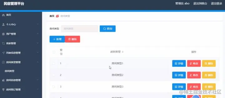 管理员房间类型管理:通过房间类型管理列表可以获取索引、房间类型、操作等信息,进行详情、修改或删除操作,如图。