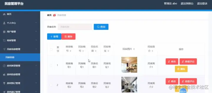 商家用户民宿信息管理:通过民宿信息管理列表可以获取商家编号、民宿编号、民宿名称、民宿地址、民宿图片、民宿简介等信息,进行查询、新增、删除操作,如图5-13所示。