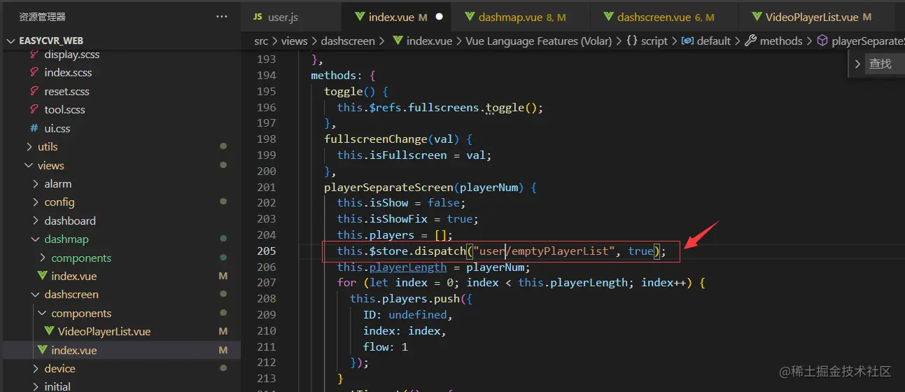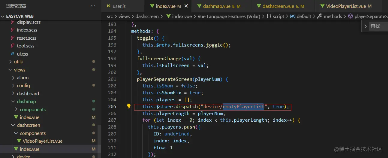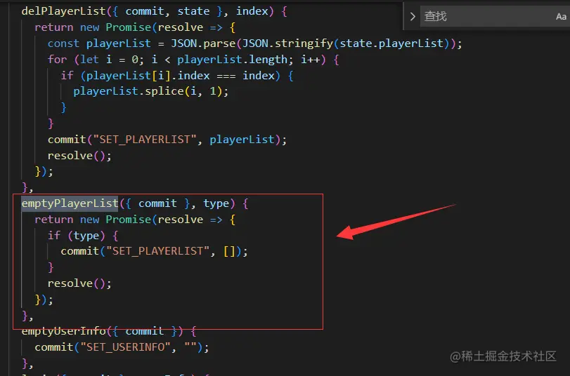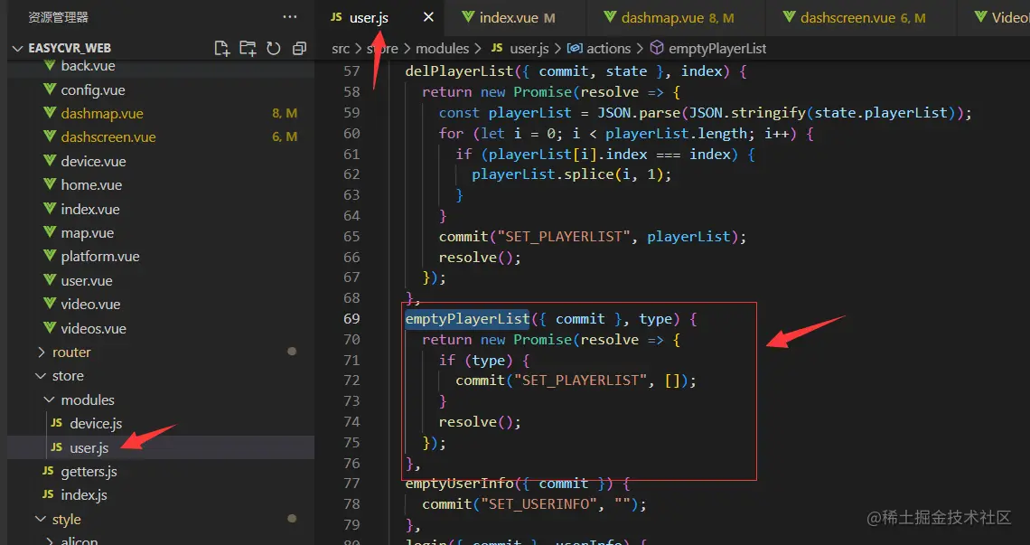 报错的意思是指找不到操作的类型。排查项目代码,可以看到device/emptyPlayerList方法已经在vuex中定义了,如图: