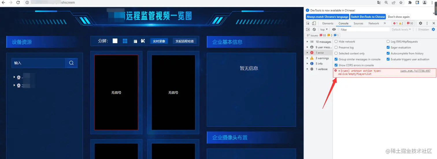 在某项目的前端开发环境中,进入项目页面出现报错:“[vuex]unknown action type: device/emptyPlayerList”。