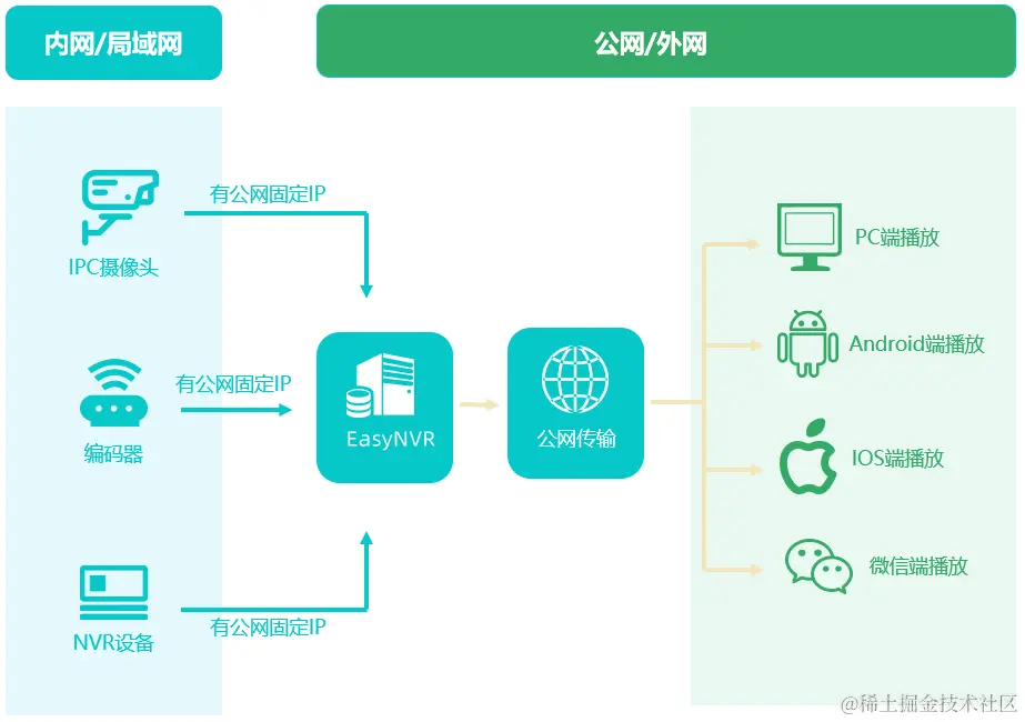 EasyNVR既有软件版也有硬件版,平台基于RTSP/Onvif协议将前端设备接入,可实现的视频能力有视频监控直播、录像、视频转码分发、检索与回放、云存储、智能告警、国标级联等。平台可将接入的视频流进行转码分发,对外输出的视频流格式包括RTSP、RTMP、HTTP-FLV、WS-FLV、HLS、WebRTC等。