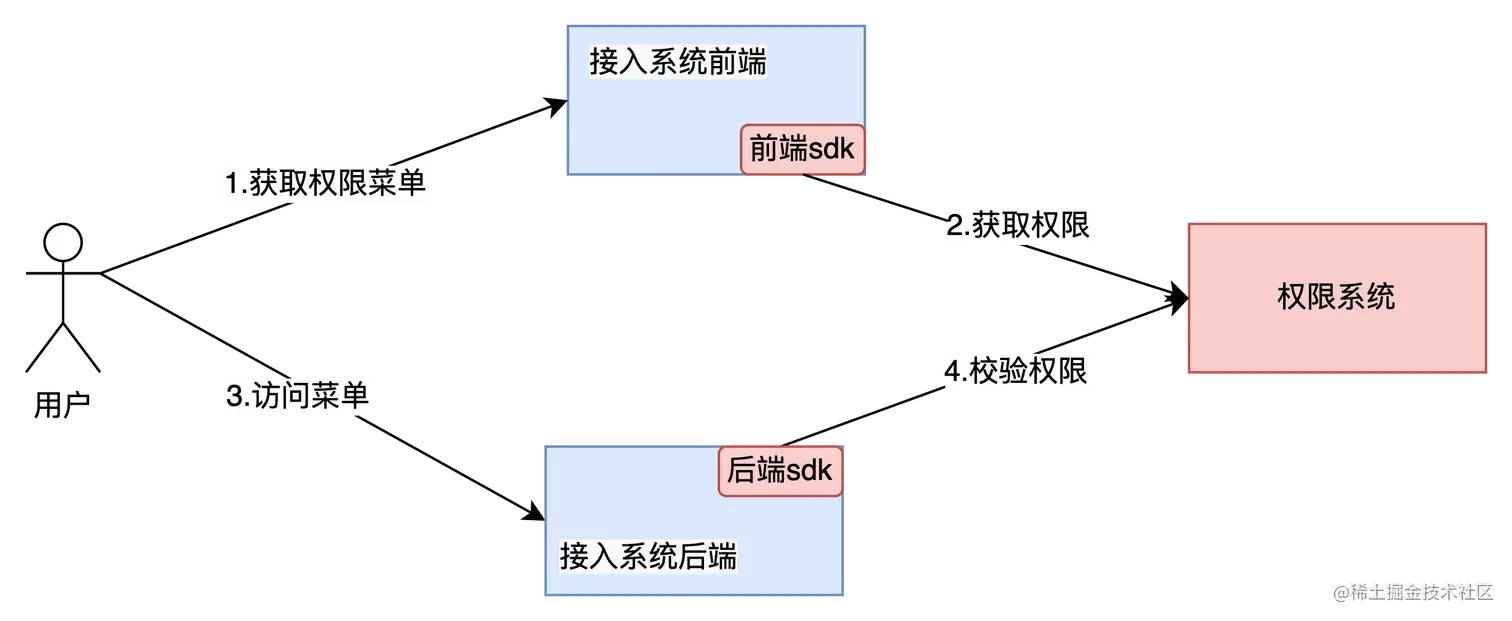 - 前端渲染:接入系统用户登录后,获取自己有权限的菜单,也就是前端sdk请求权限系统获取有权限的菜单并进行自动渲染。