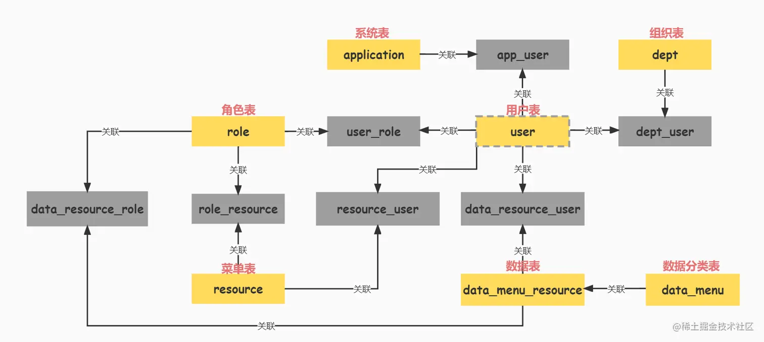 从上图中可以看到转转权限系统和RBAC一些差异:用户直接可以与菜单或者数据绑定,增加灵活性。