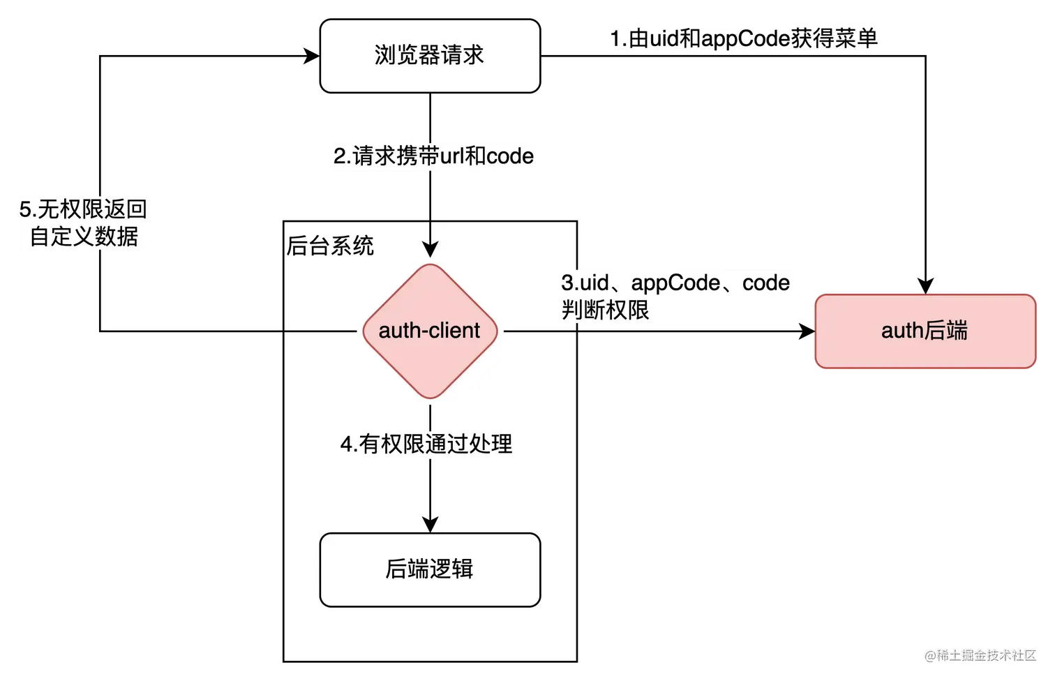 - 后端鉴权:用户请求接入系统后端,拒绝没有权限的接口访问,防止无权限用户获取后端接口地址后直接访问无权限的接口。