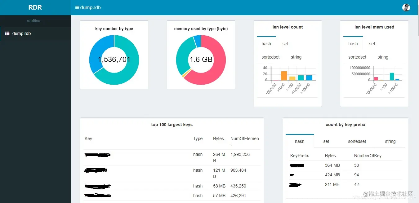 界面上包含饼状图,柱状图以及top排行来从各个维度显示redis中数据的统计,基本上能满足需求,如果感觉top100不能满足你的需求,想看到更多的key,可以使用下列命令查看: