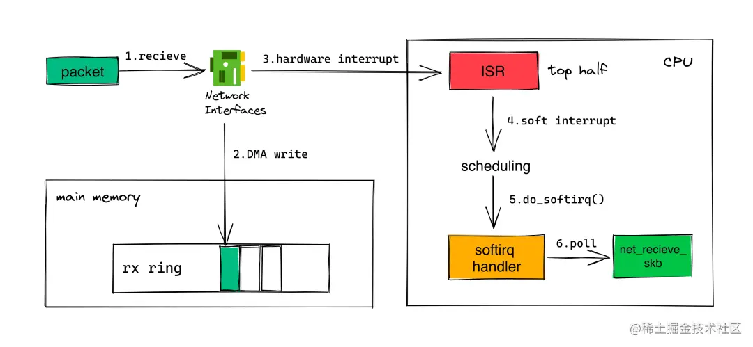 网卡设备每接收到一个二层的网络帧后,使用硬件中断来向 CPU 发出信号,通知其有新的帧需要处理。收到中断的CPU会执行 do_IRQ函数,调用与硬件中断号关联的处理程序。处理程序通常是由设备驱动程序在初始化时注册的一个函数,这个中断处理程序将在禁用中断模式下执行,使得 CPU 暂时停止接收中断信号。 中断处理程序会执行一些必要的即时任务,并将其他任务调度到下半部中延迟执行。在 Linux 中,具体来说中断处理程序会做这些事情: